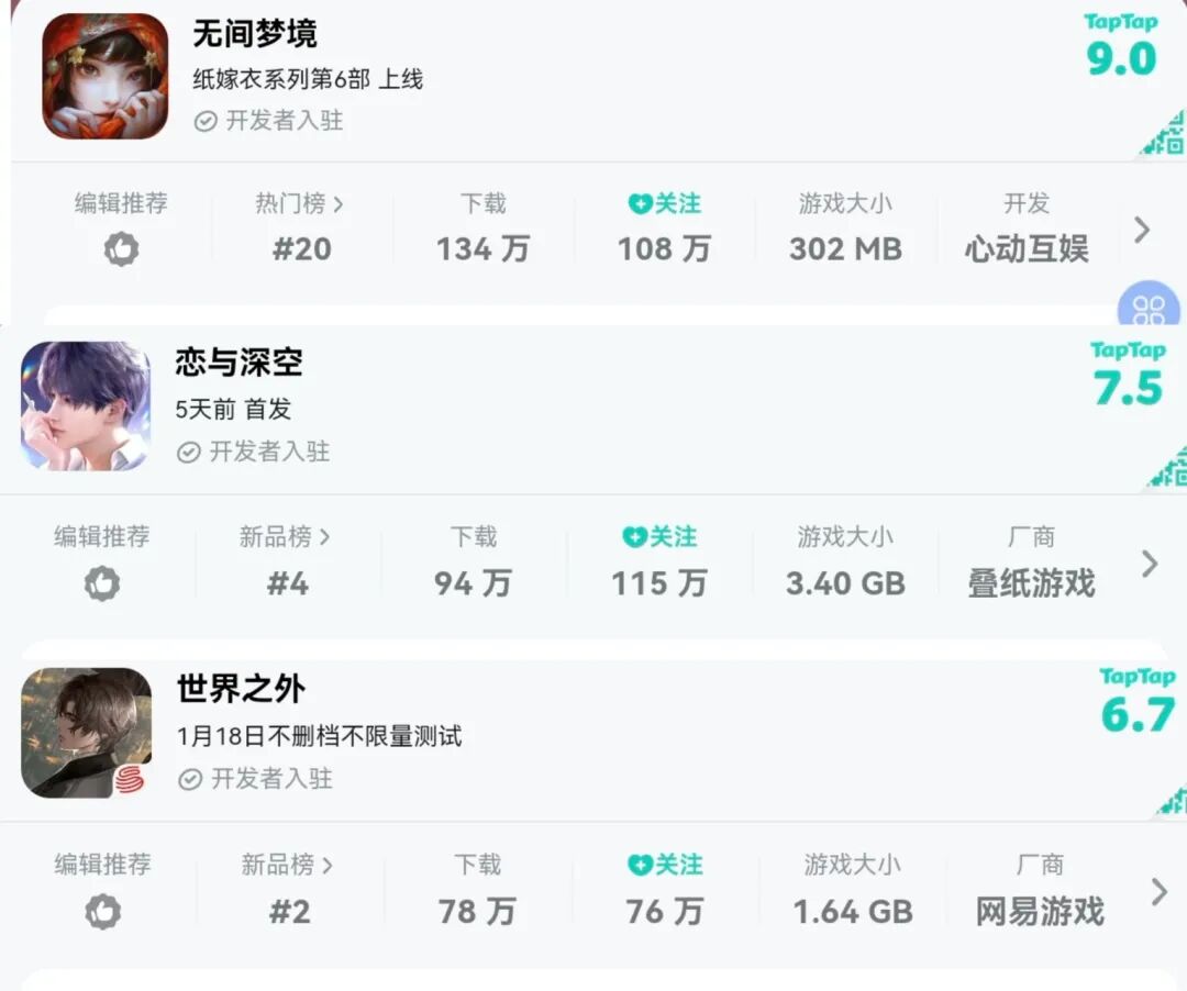 2024开年游戏大厂打得不可开交,突出重围的却是心动互娱的《纸嫁衣6》。在游戏市场把目光都聚焦在乙游赛道时,1月19日上线的恐怖解谜游戏纸嫁衣系列第六部作品《无间梦境:千秋魇》(以下简称《纸6》),在几乎没有宣发和营销的情况下,悄悄惊艳了所有人。据TapTap游戏社区数据显示,目前《纸6》的下载量达到134万,而早一天上线的《恋与深空》和《世界之下》下载量分别只有94万和78万,心动互娱靠着一款单机游戏在2024年的游戏市场大放异彩。从目前的市场反馈来看,《纸6》延续了前作的高口碑,TapTap评分高达9分,而大部分玩家把五星好评给了剧情。事实上,从2021年至今,三年产出六部游戏,心动互娱已经在游戏市场摸索出了一套新的打法,在游戏中讲好故事,以媲美影视剧的高品质剧情留住玩家。而随着剧情的持续优化,《纸嫁衣》系列接二连三被影视立项,这一模式为心动互娱在游戏IP全产业链的开发上带来了更多可能。